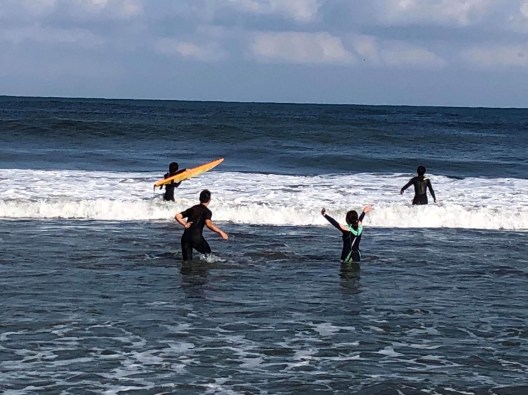 他の班よりも早めに昼食を済ませ、千倉海岸へ向かいました。そこで、インタビュー対象者でプロサーファーの伊藤健一さんと一緒にサーフィン体験をしました。台風の影響で中止の可能性があったんですが、海に入ることができて本当によかったです。その後のインタビューでも、サーフィンを体験したおかげで、分かり合えることもありました。